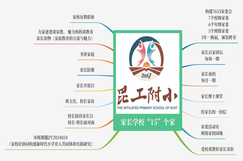 3.家校社协同育人:创新“15个家”机制(如家长课堂、家长开放日、家委活动室等),构建家校共育生态,提升教师幸福感和学生学习体验。学校专门成立了以校长为组长,德育分管领导为副组长,德育主任、年级主任、班主任和家委会家长为成员的家庭教育领导小组,建立了“家校共育中心”,构建了完善的校级家委会、年级家委会、班级家委会三级家委会制度,保障家校社协同育人落地生根。学校历经多年实践,形成多元畅通的家校沟通模式。家、校、社三方以互信为本,互学为法,互助为靠,互补为机,互赢为标,构建共同体,营造“互信、互学、互助、互补、互赢”共育生态。基于此,学校推出 15 个“家”活动,逐步完善家校社协同育人服务体系。